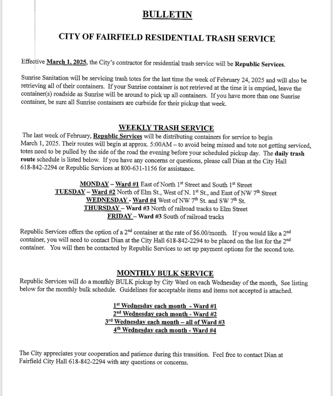 Utility Hotline (Power Outages) – 618-842-2151 Fairfield Zoning Office: Doug Skaggs Fairfield Police: Keith Colclasure Cemetery Department: Carroll Dugger
